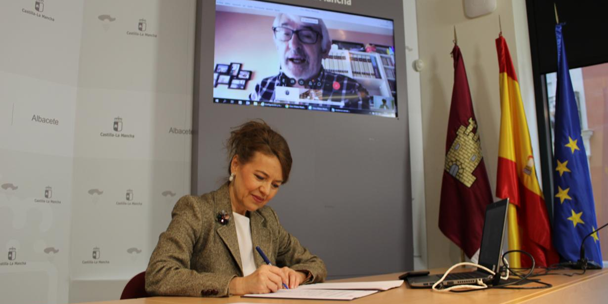 La consejera de Bienestar Social, Aurelia Sánchez, durante la firma del convenio de colaboración con Cruz Roja, cuyo presidente regional, Jesús Esteban.