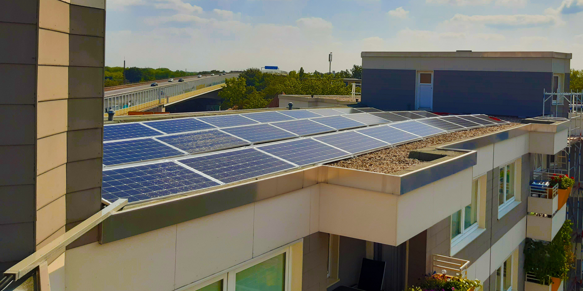 Placas de autoconsumo fotovoltaico sobre cubierta de un edificio residencial.