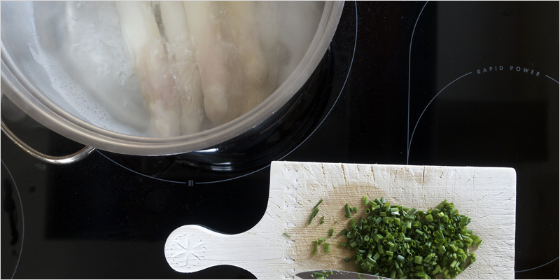 Vitrocerámica con una olla y una mesa de cortar con pimiento.