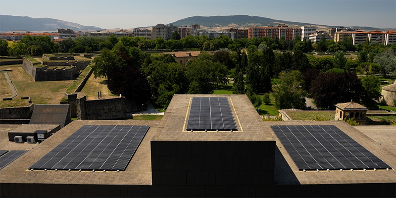 El Palacio de Congresos y Auditorio de Navarra, Baluarte, avanza hacia la sostenibilidad energética con la puesta en marcha de una instalación fotovoltaica en su cubierta. En concreto, la cubierta está compuesta por 616 paneles solares con los que prevé generar el 18% de su consumo eléctrico y reducir un 15% su gasto energético anual. El objetivo a medio plazo es construir una comunidad energética que permita abastecer a infraestructuras que, por su catalogación como edificios históricos, no puedan acoger instalaciones solares en sus cubiertas.