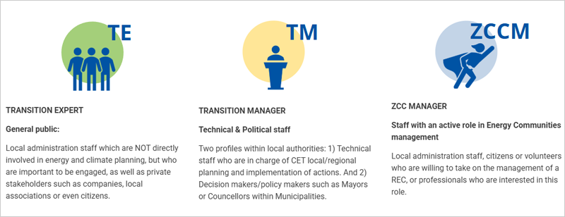 Finalmente, el rol de Gestor de Comunidades de Carbono Cero (ZCC) se centra en aquellos que participan activamente en el desarrollo y la operación de comunidades energéticas, desde el personal administrativo y voluntarios hasta los profesionales interesados en la gestión de comunidades de energía renovable, proporcionándoles herramientas y recursos para guiar las iniciativas energéticas comunitarias hacia un futuro de carbono cero. Estos perfiles ayudan a los usuarios a navegar por la caja de herramientas y acceder a los recursos más relevantes para sus responsabilidades y nivel de experiencia en la transición a la energía limpia. En este caso, también hay disponibles 11 módulos en el piloto navarro.