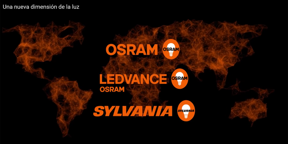 Pantallazo del vídeo corporativo de Ledvance con sus tres marcas: Osram, Ledvance y Sylvania.